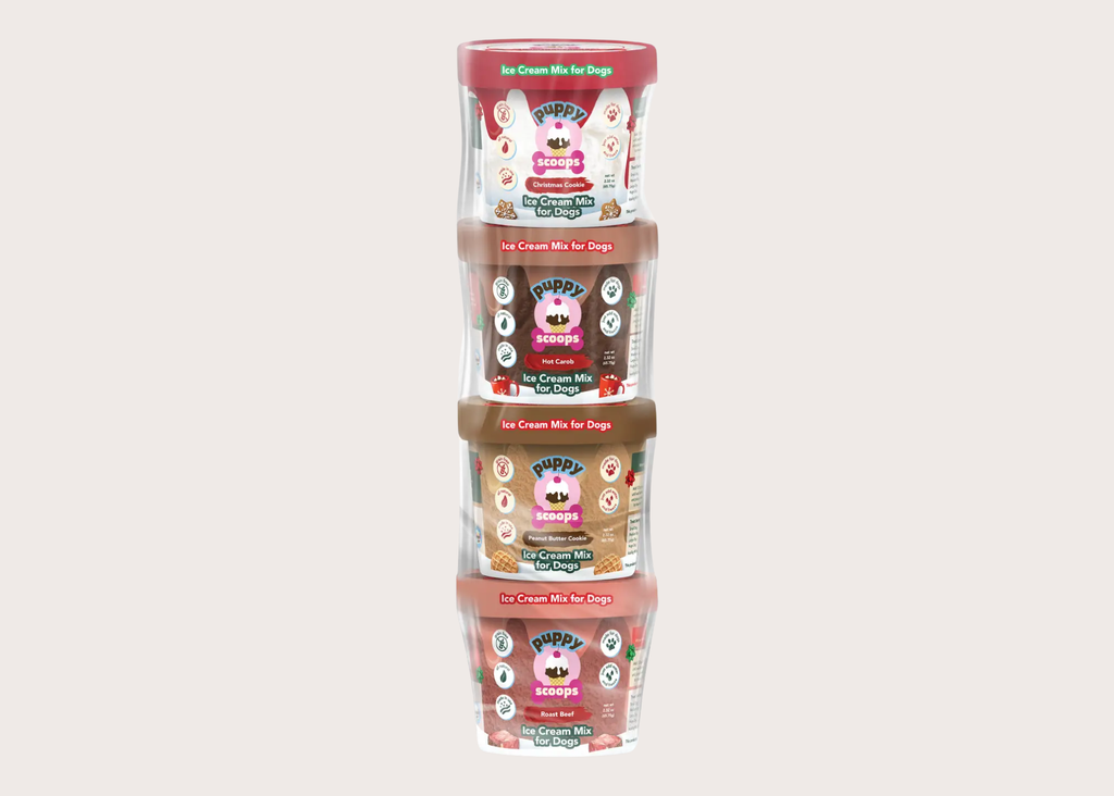Unwrap the ultimate holiday treat for your furry friend with this paw-some Limited Edition Holiday Puppy Scoops Gift Set! This festive collection features four exclusive seasonal flavors—Christmas Cookie, Hot Carob, Peanut Butter Cookie, and Roast Beef—each crafted to bring tail-wagging joy to your pup's holiday season. Making homemade dog ice cream is a breeze: simply mix our shelf-stable powder with water and freeze. It's the perfect way to celebrate the season while treating your beloved companion to something special and delicious!