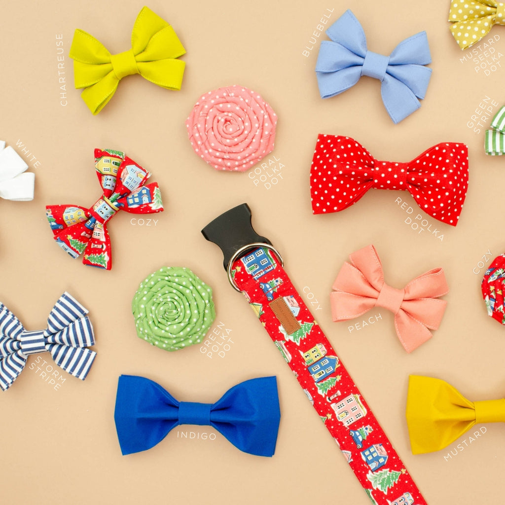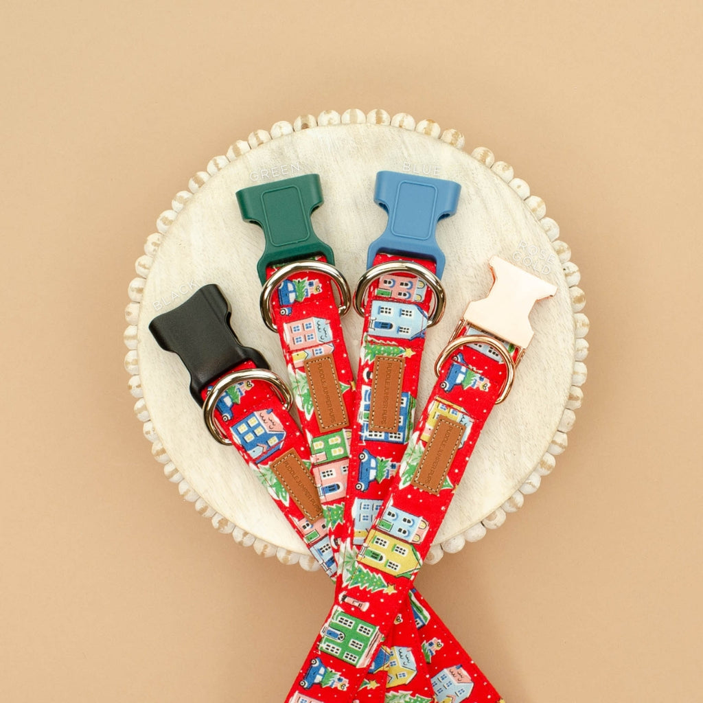 A sleepy holiday village in quirky colors. This happy snowglobe of a town is best for collars and leashes 1” wide and larger, otherwise you might only get the housetops.