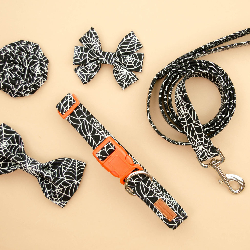Embrace the darker side of Halloween with the Gwen, a sleek black print laced with intricate white spiderwebs, perfect for a pup who loves a bit of spooky sophistication.