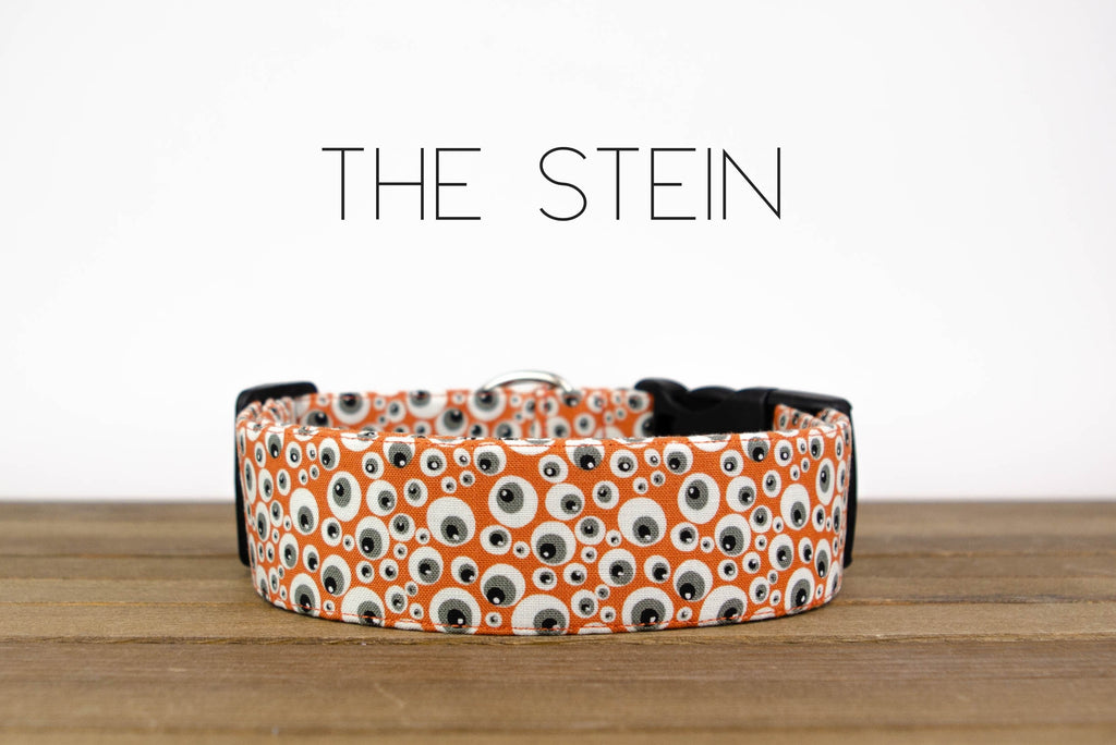 Get into the spooky spirit with the Stein, an eerie orange print scattered with wide-eyed eyeballs that add a quirky, fun touch to your pup's Halloween look.